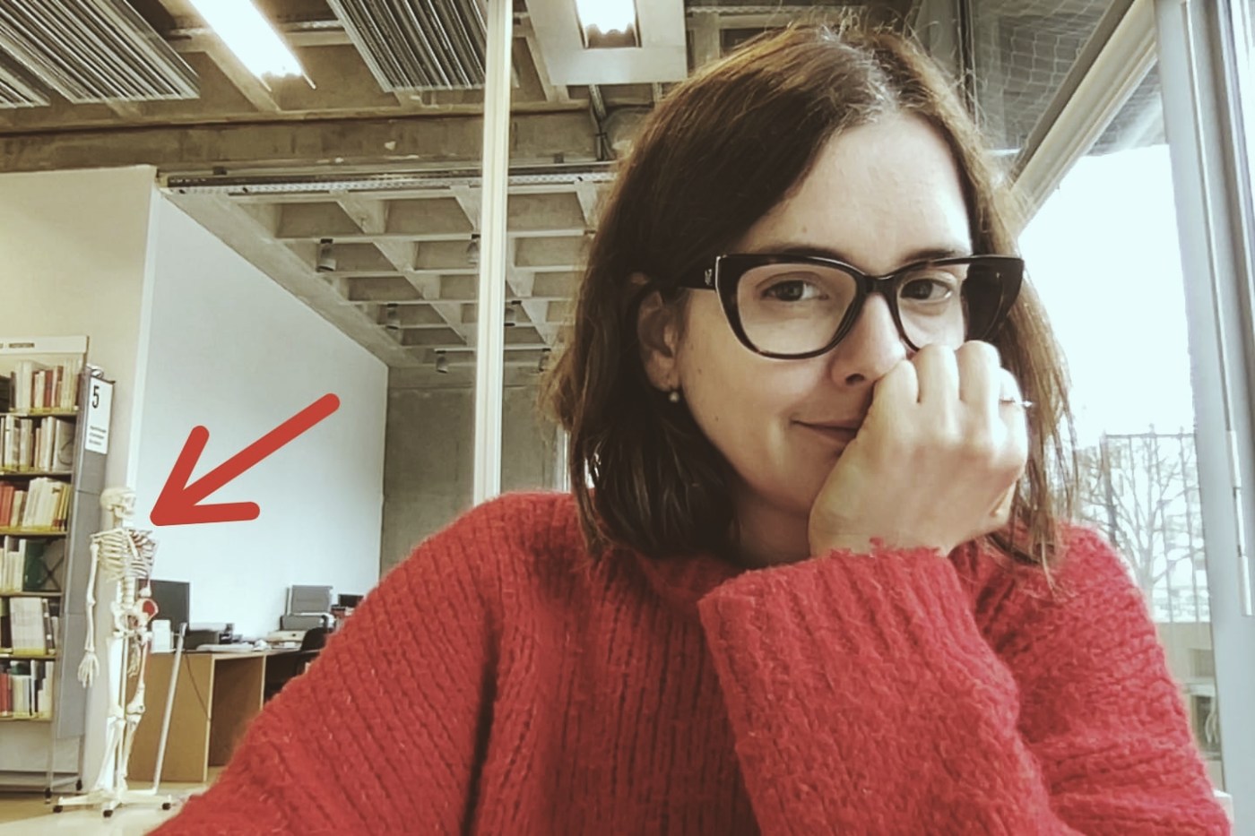 Por un momento siento que he perdido de vista al viejo, parece que se ha ido, que ya no está en la sala de lectura, tampoco veo su bastón. Aprovecho la pausa para hacerme un selfie y me doy cuenta de que detrás de mí hay un esqueleto, debe de ser el típico muñeco que utilizan los estudiantes de anatomía y los bailarines para observar los movimientos, para comprender las articulaciones.